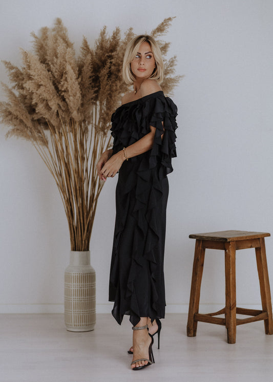 Black ruffled blouse with curls
