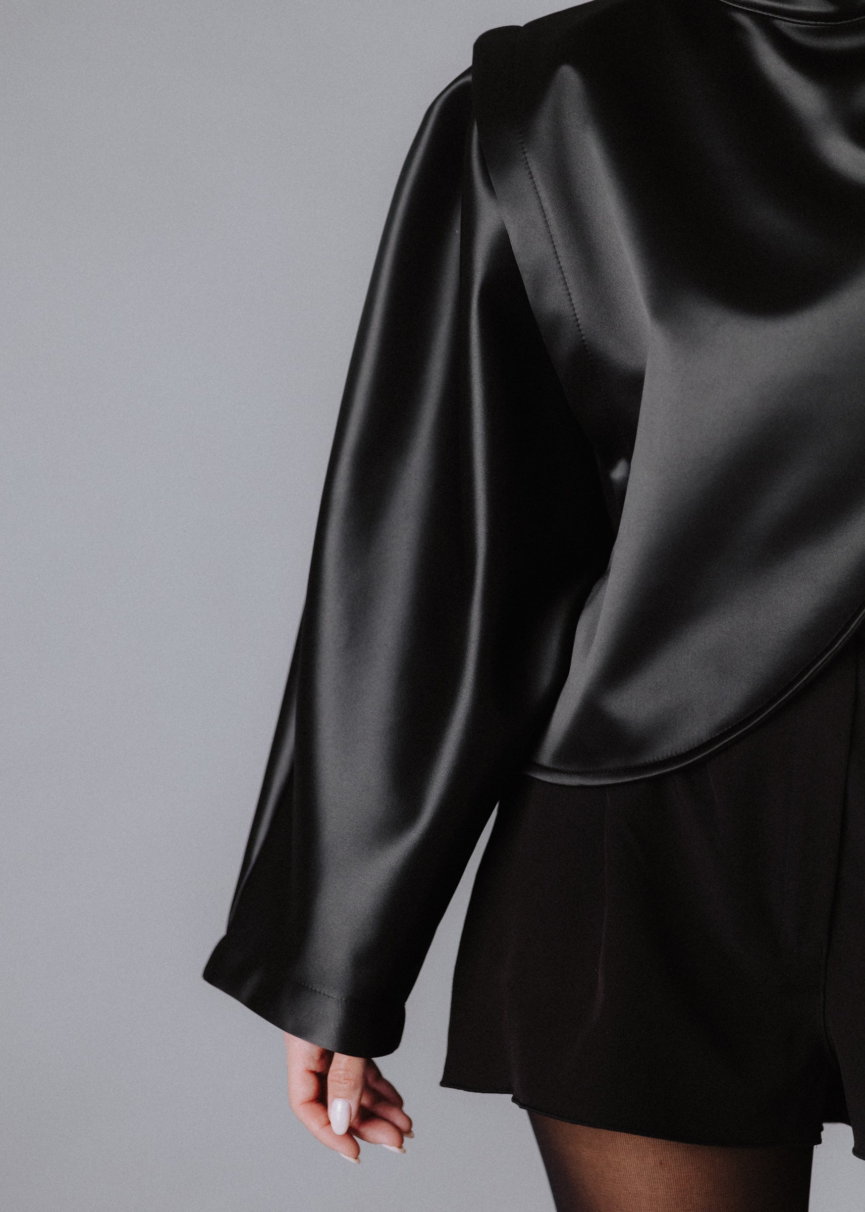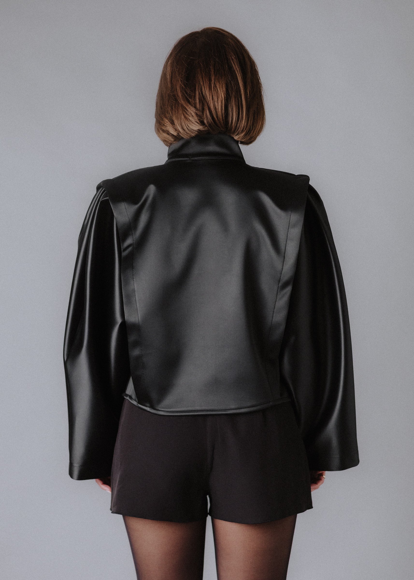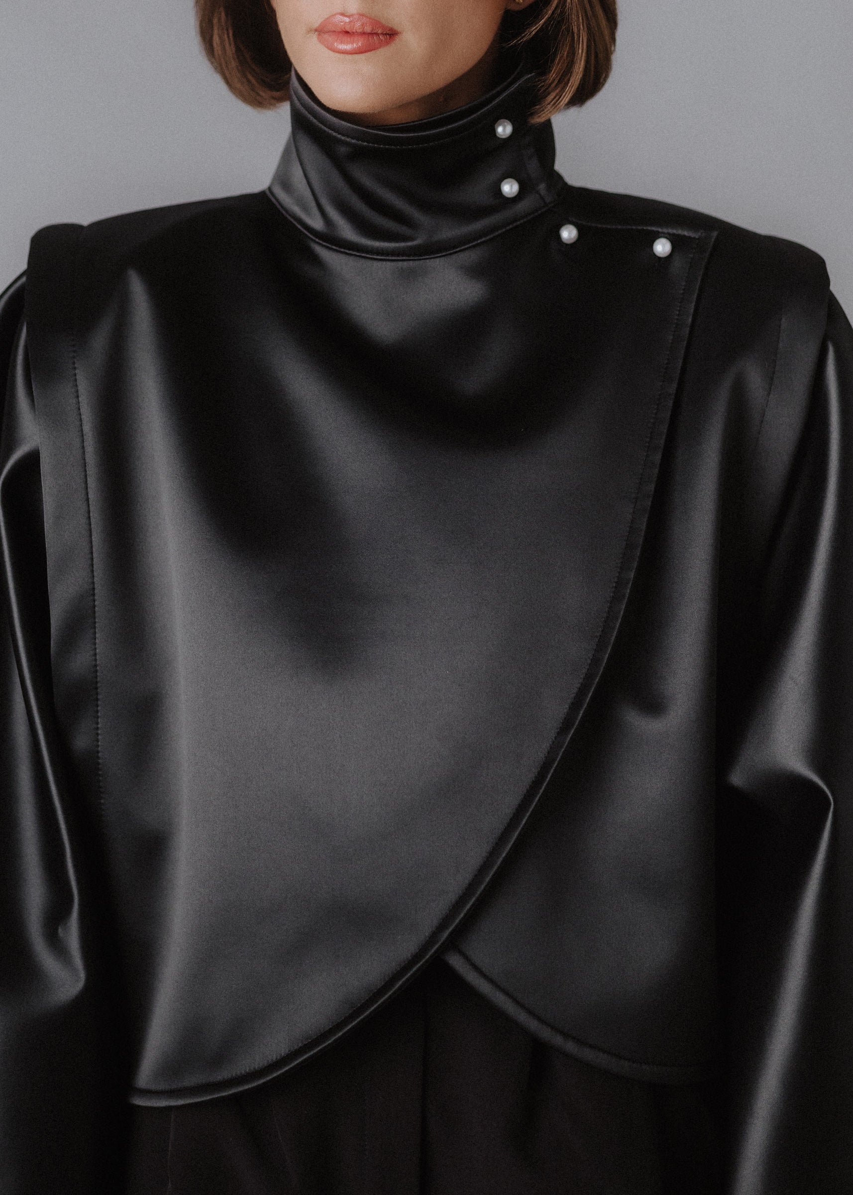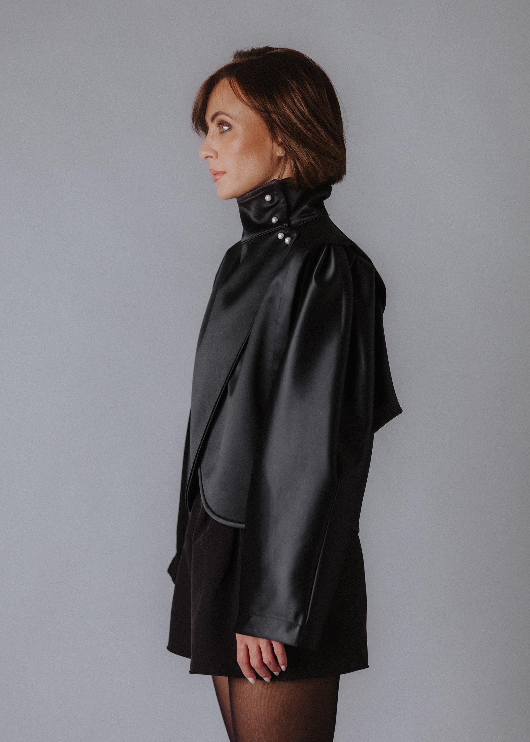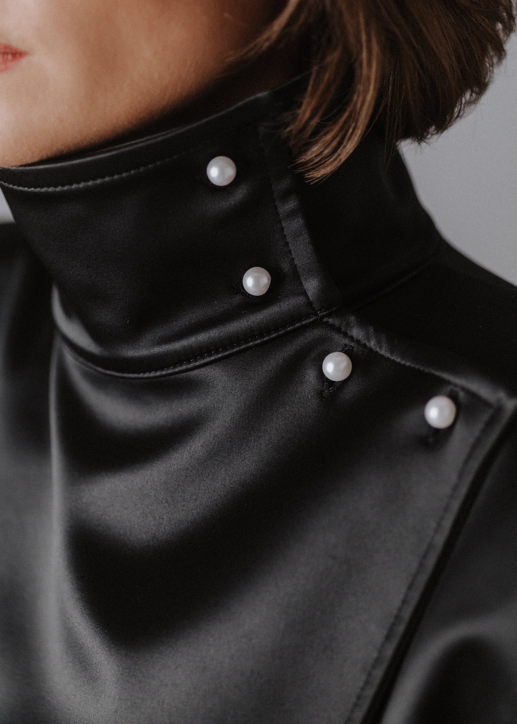 Oversized jacket made of scuba material (unlined), with a high neck and pearl buttons.
