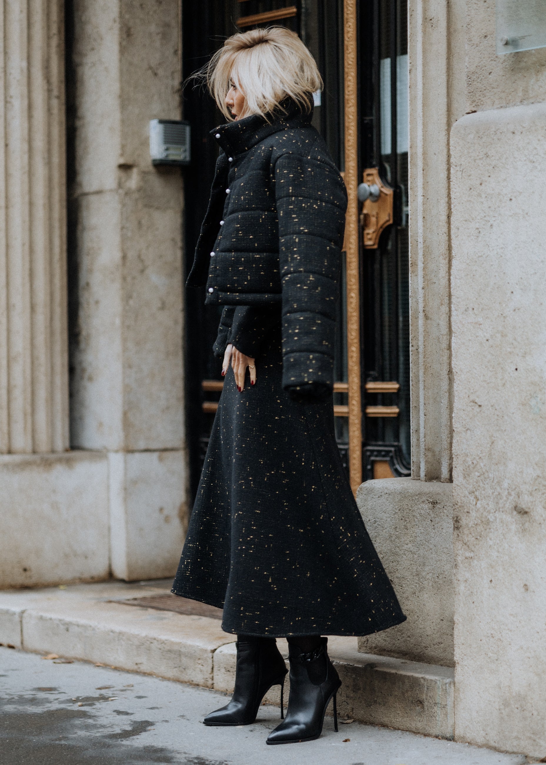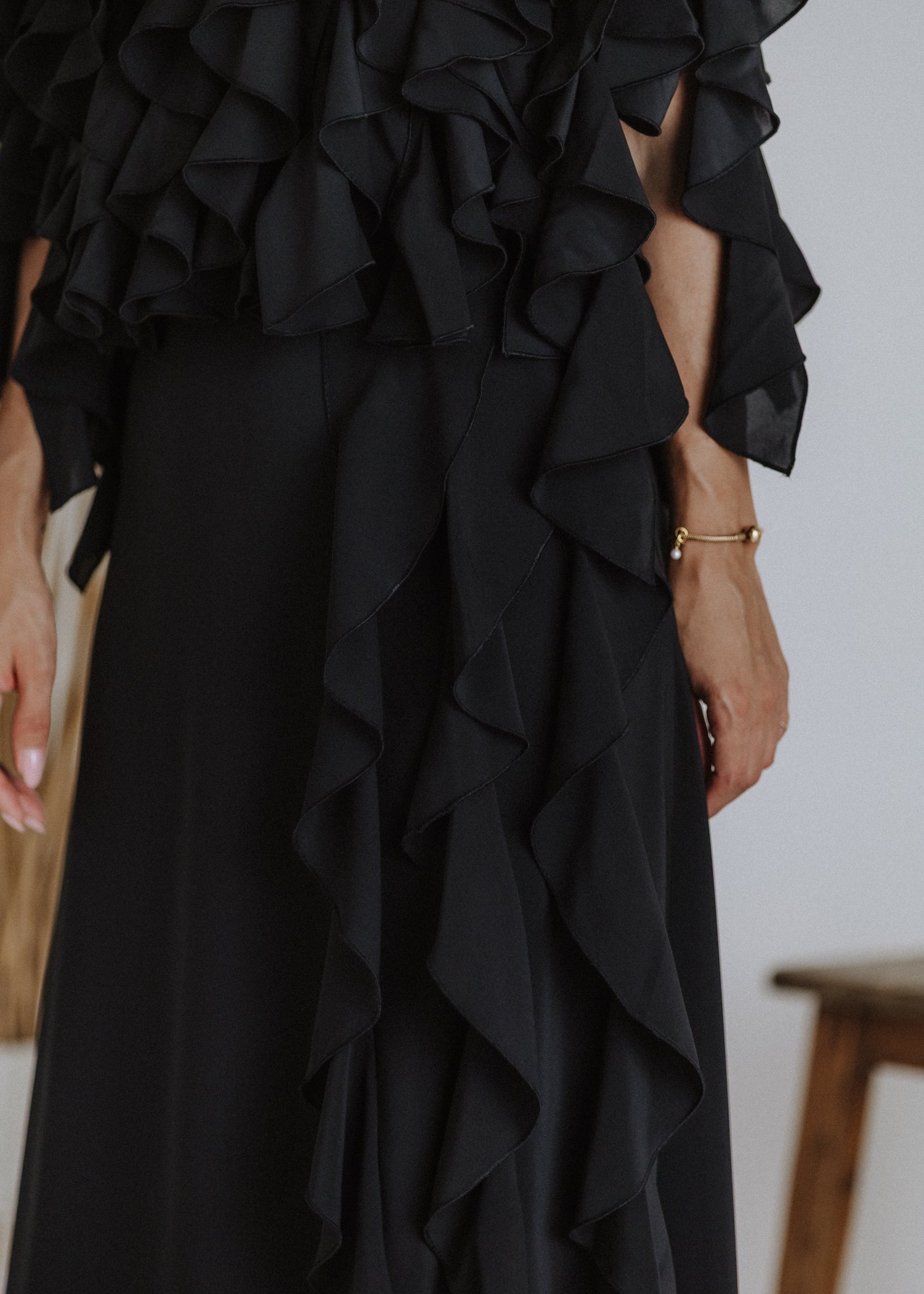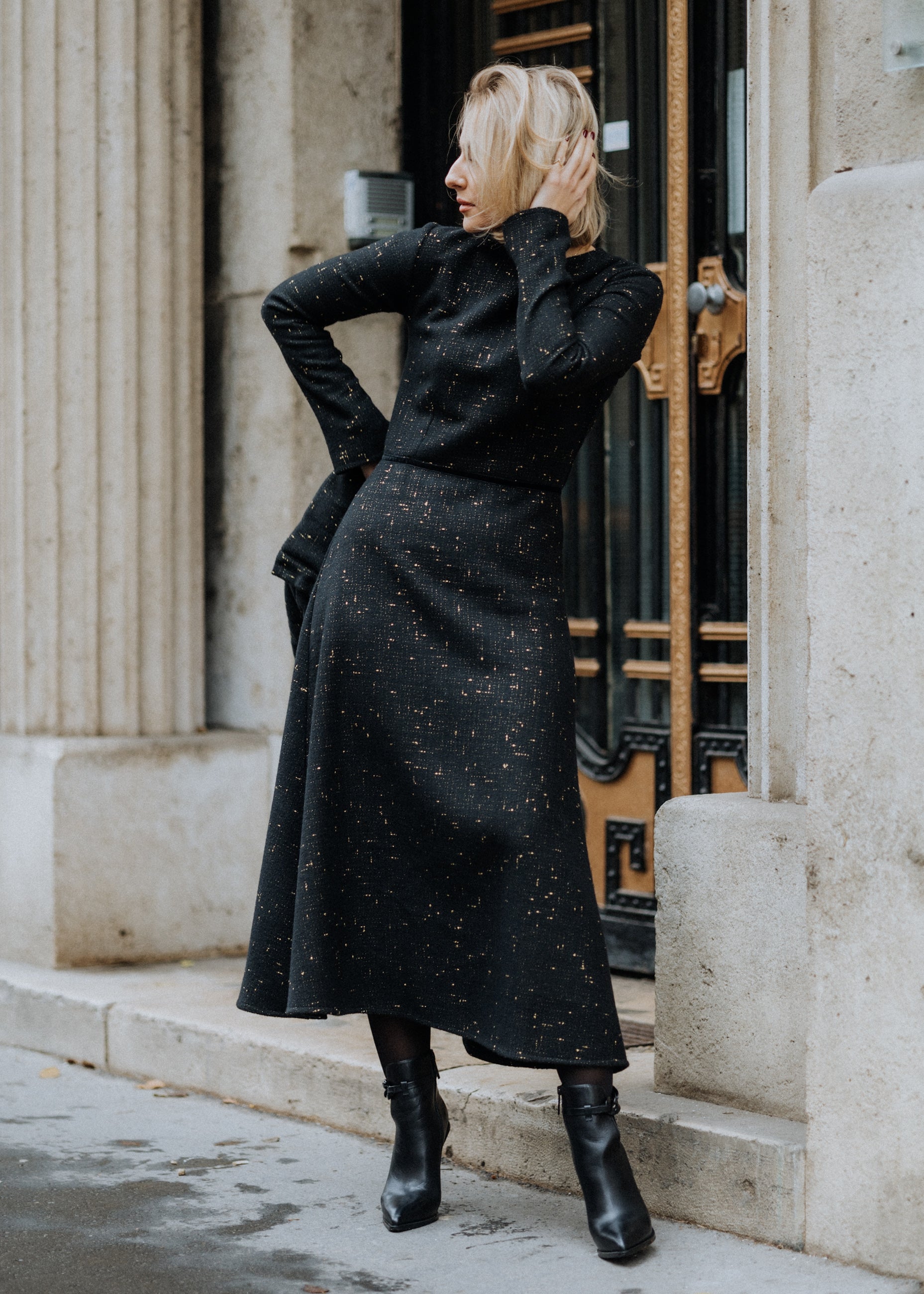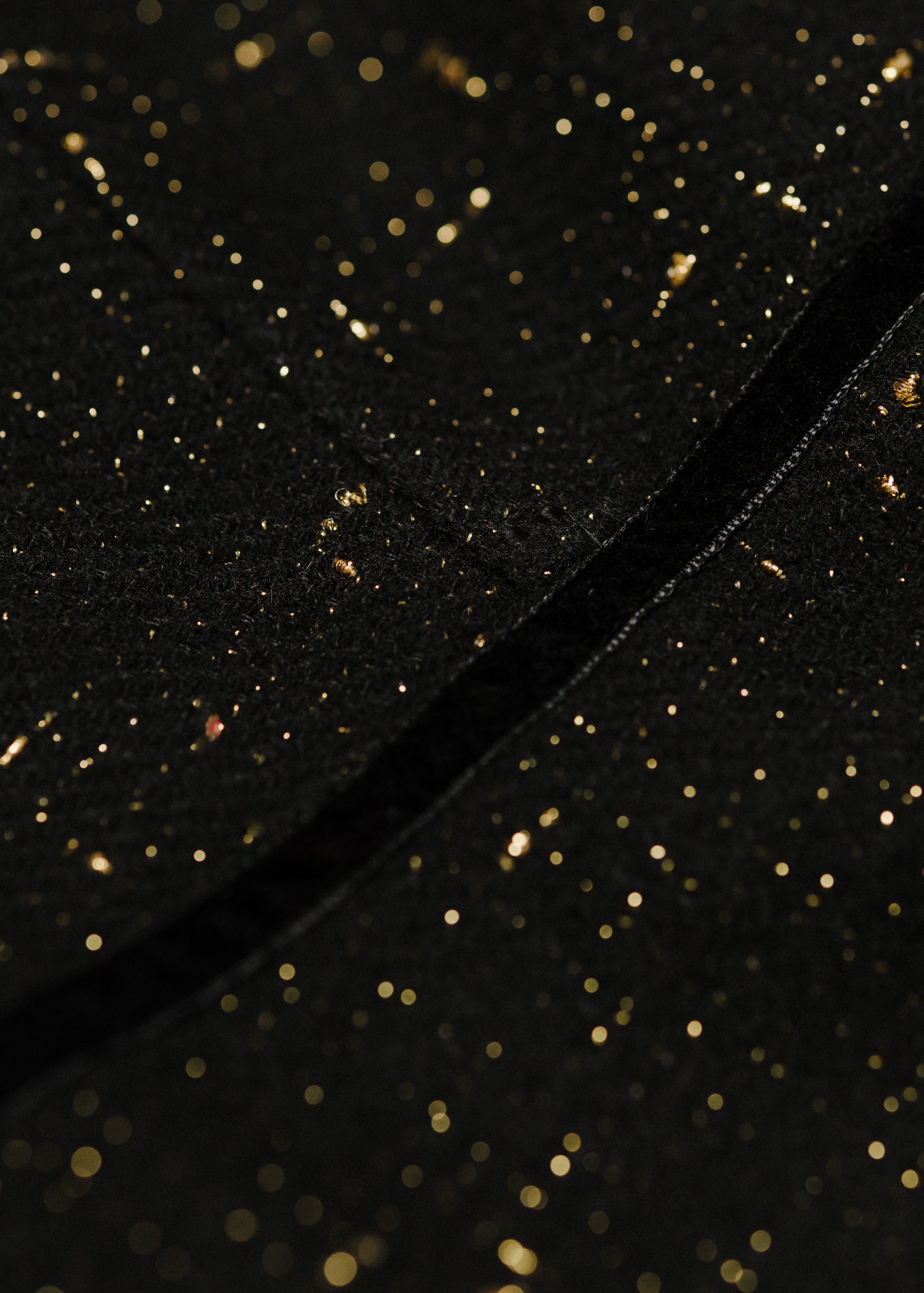 Fekete buklé ruha metál arany szálakkal és bársony díszítéssel.