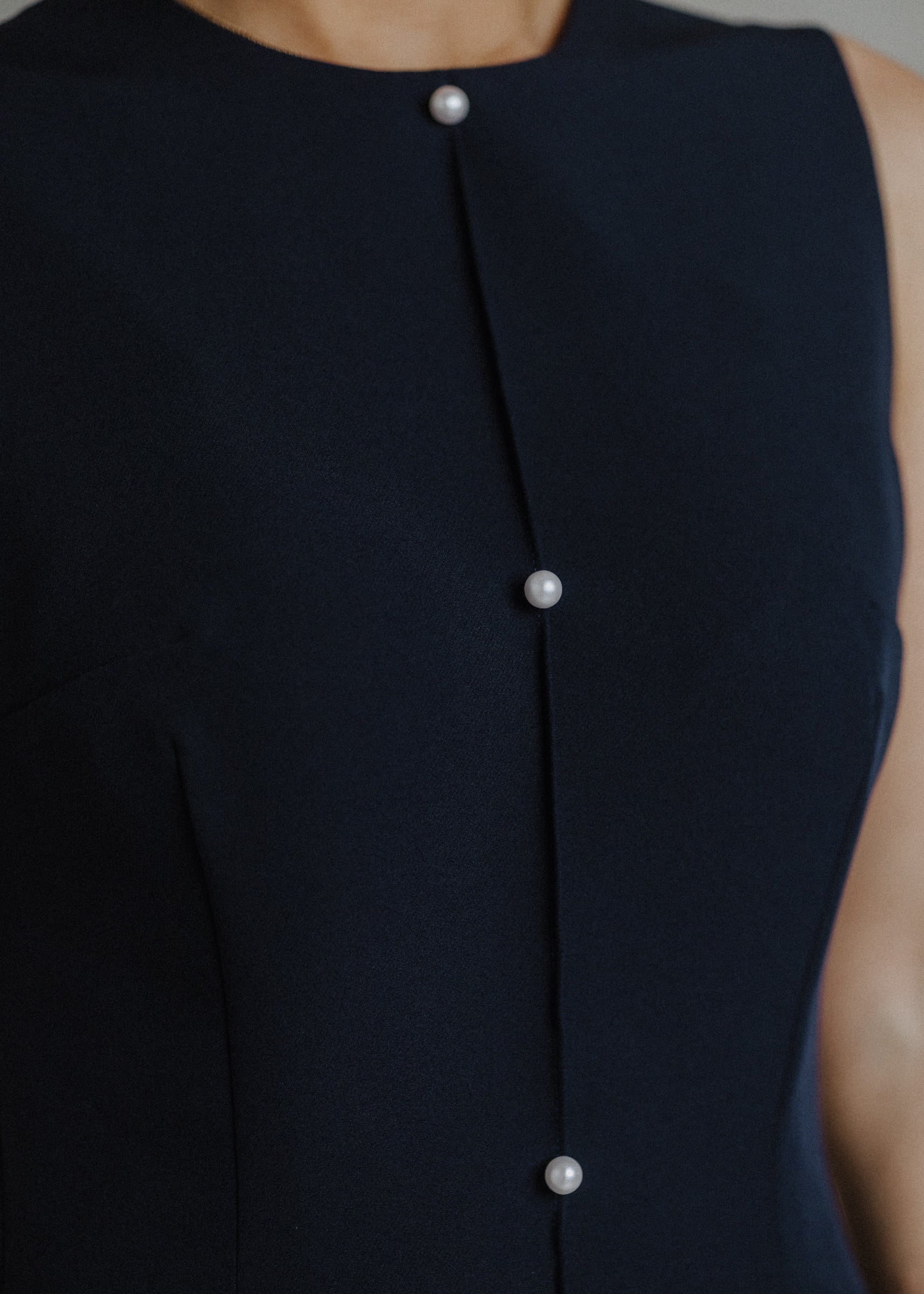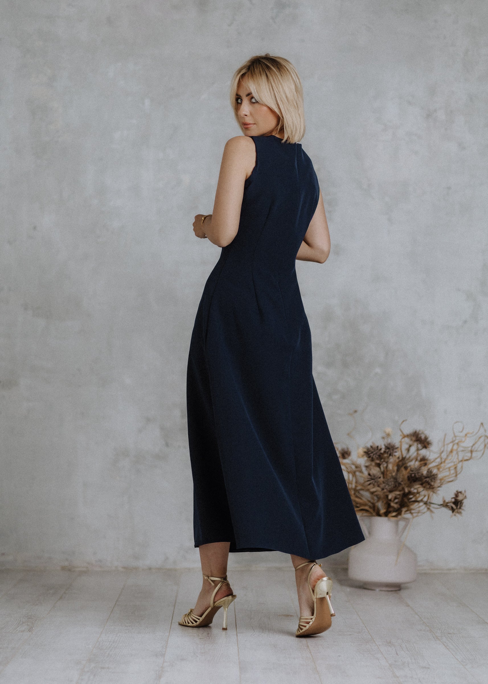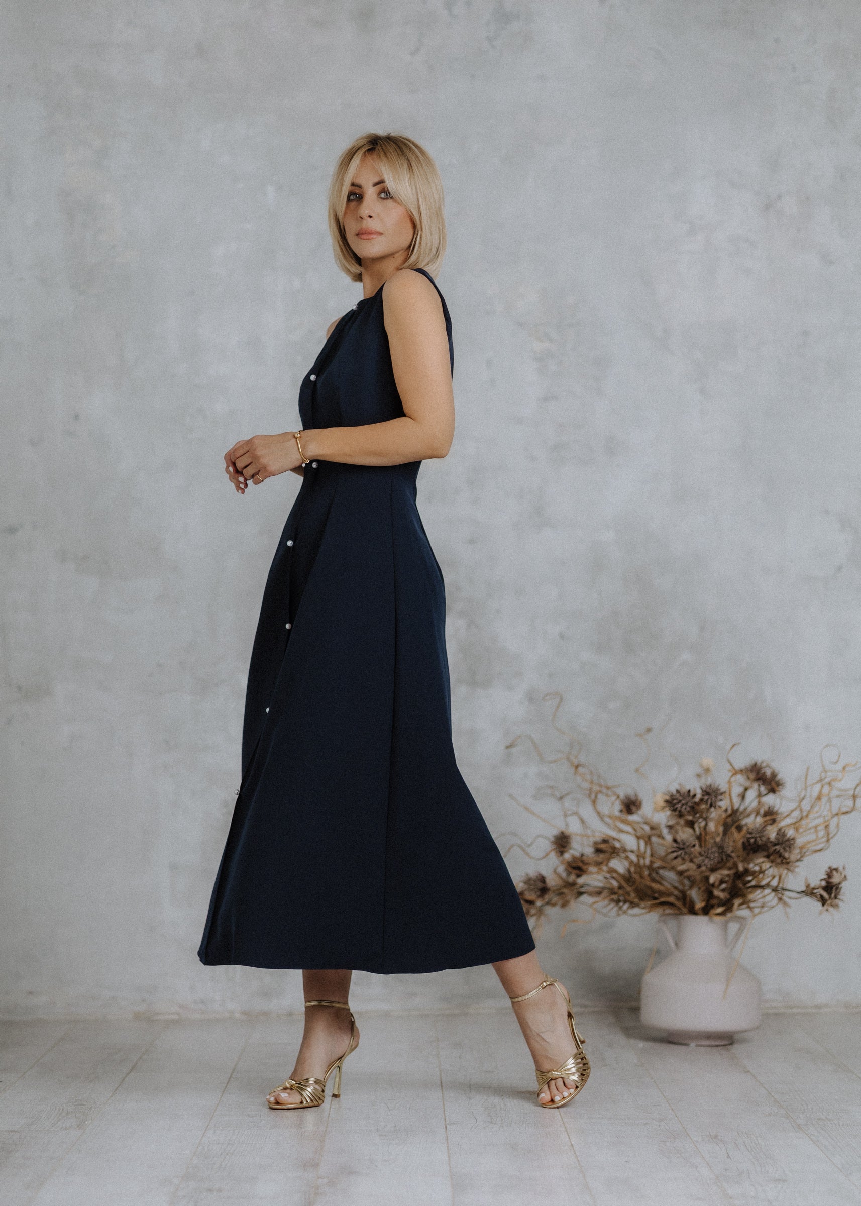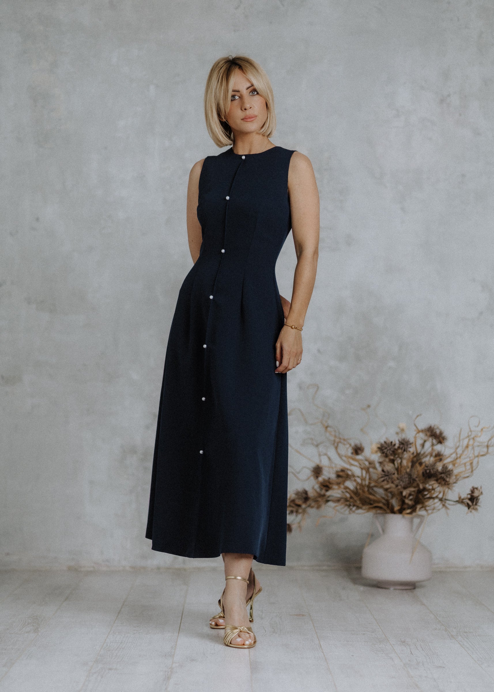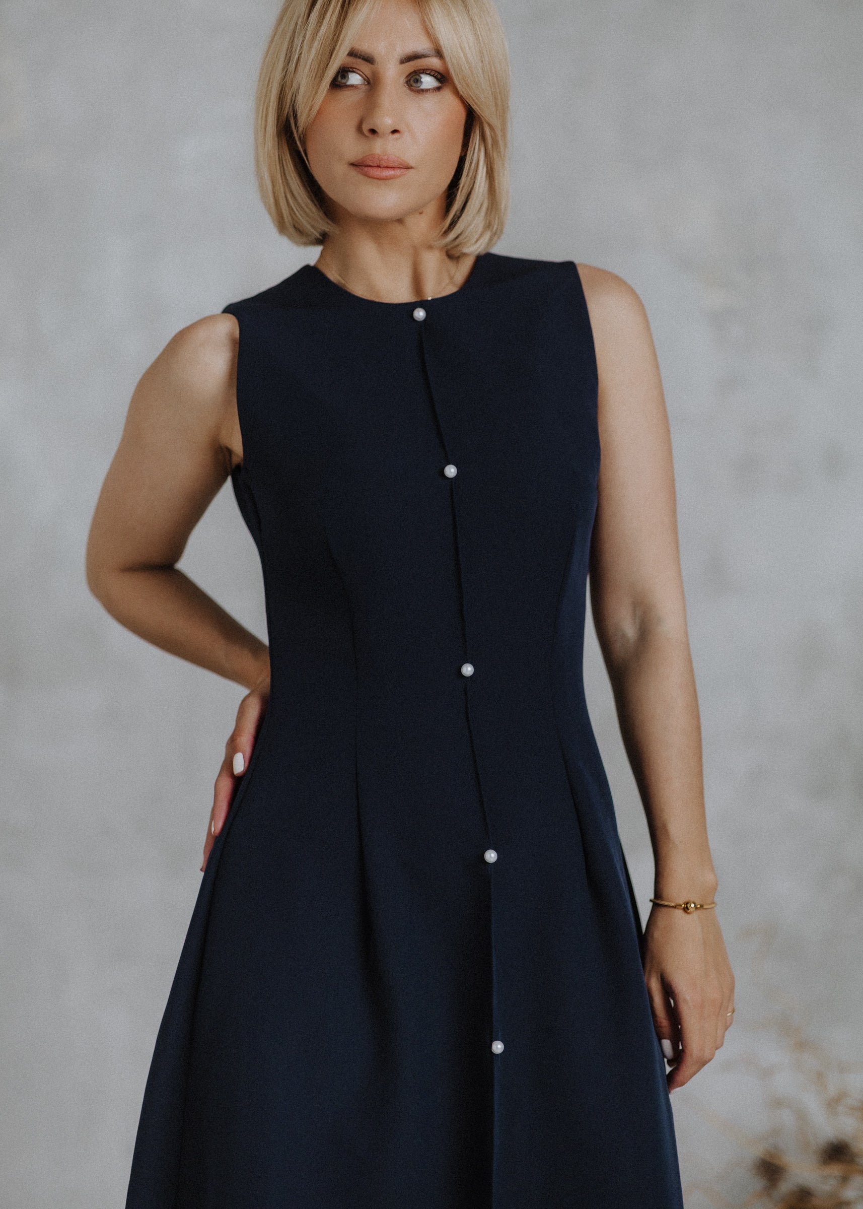 Ujjatlan sötétkék midi ruha, elől élvarrással és gyöngygombokkal díszítve.