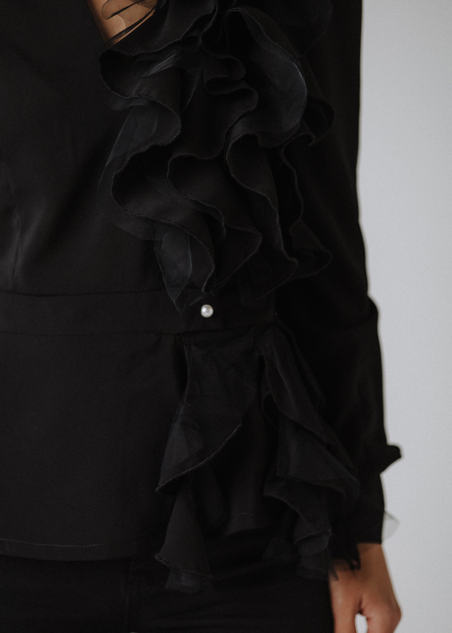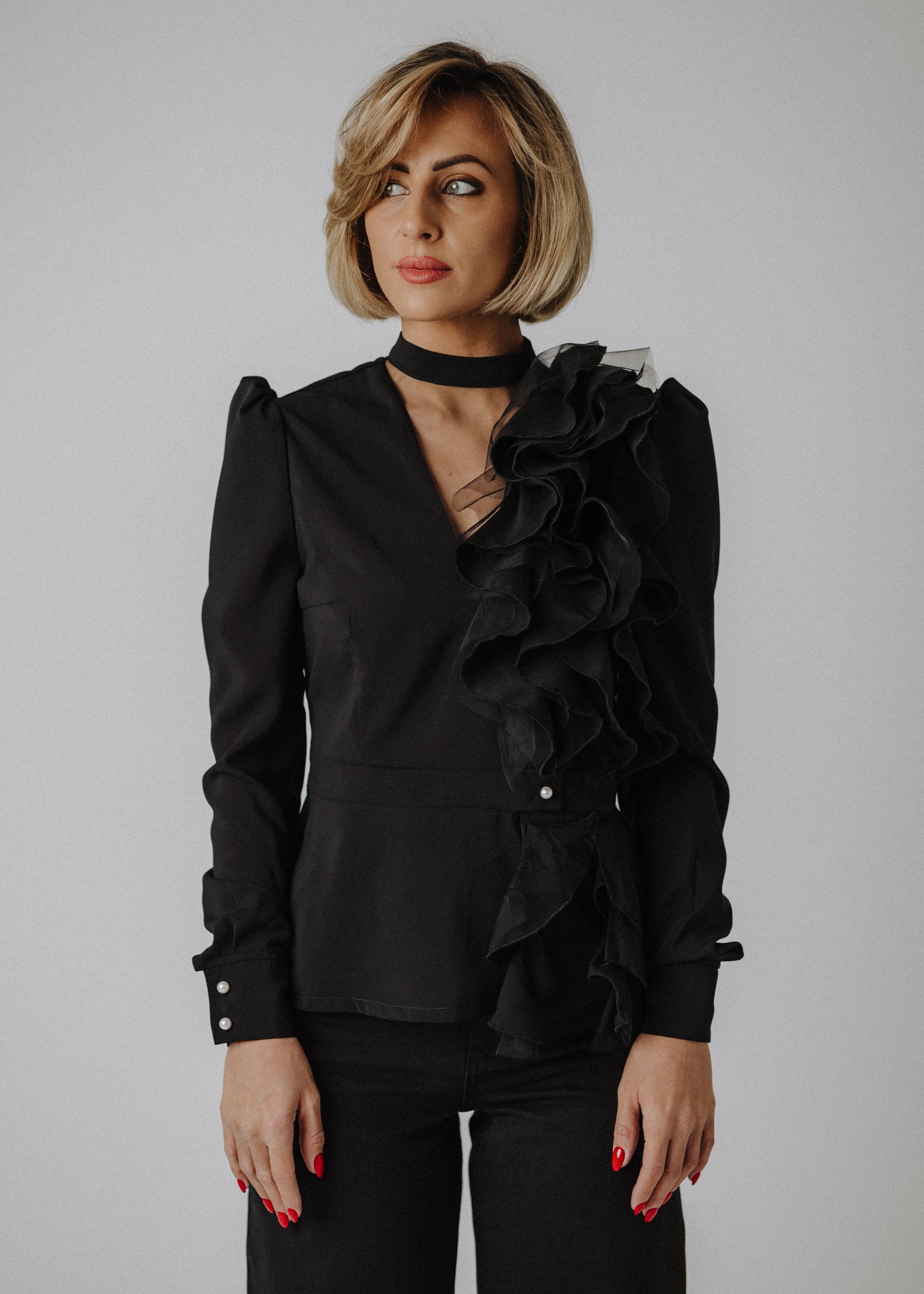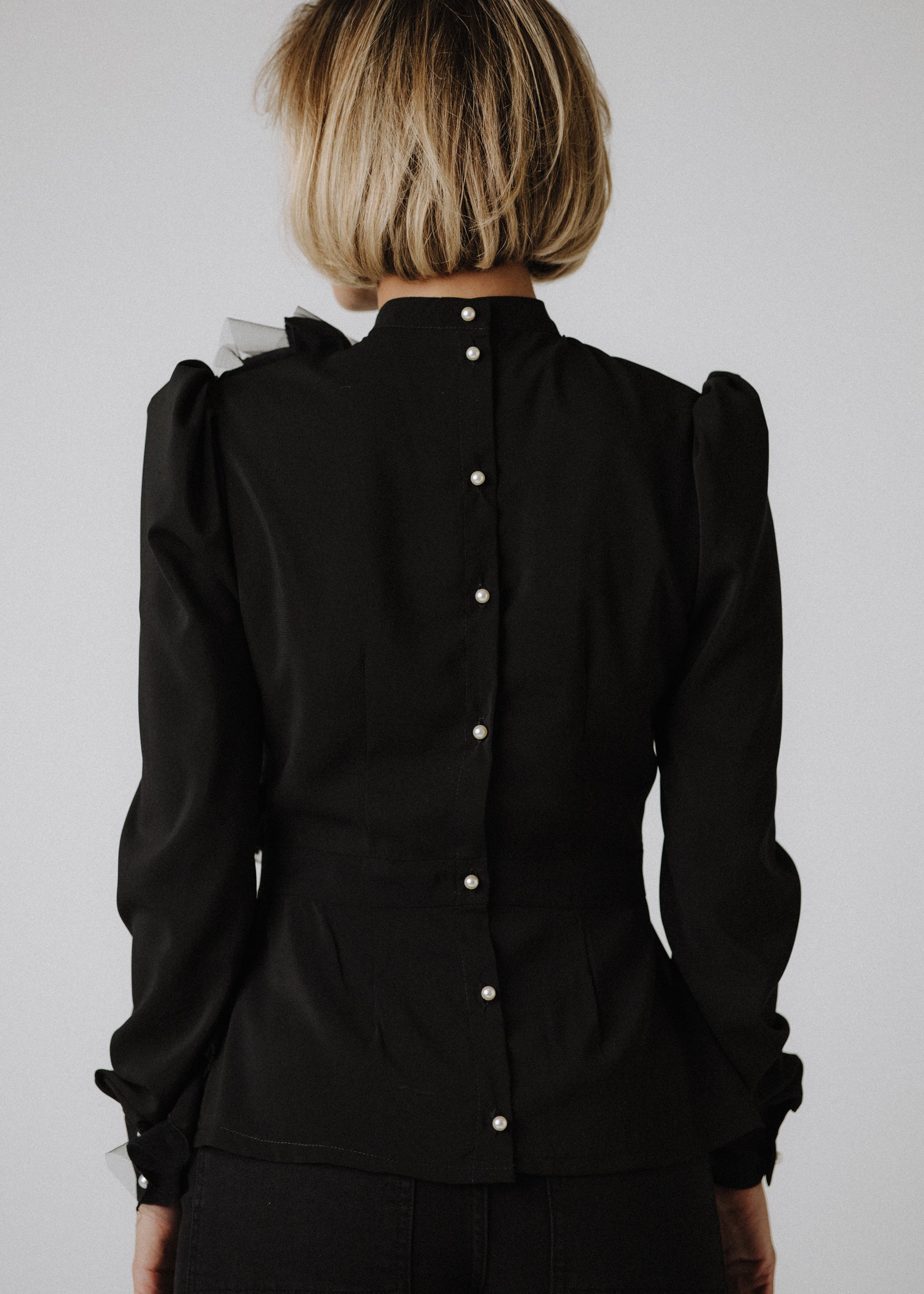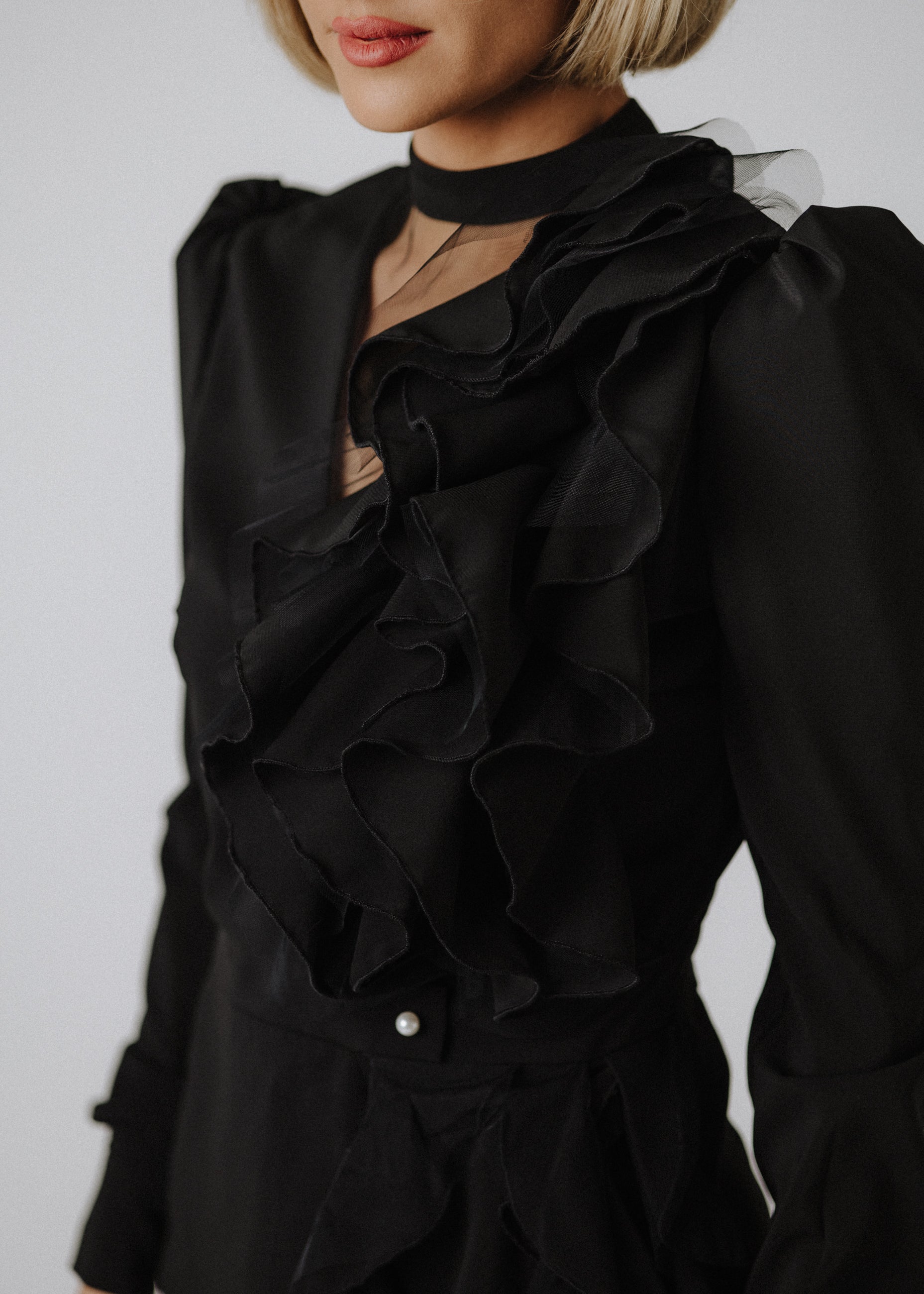 Fekete muszlin felső, lokni fodrokkal muszlinból és tüllből.