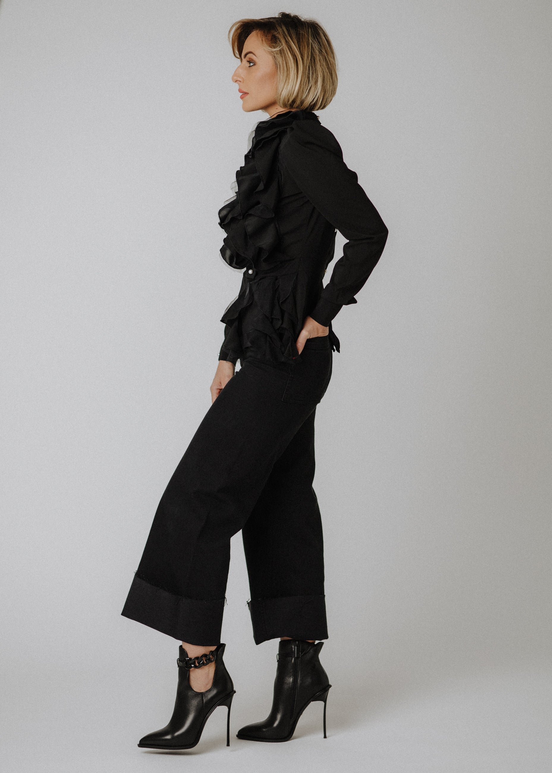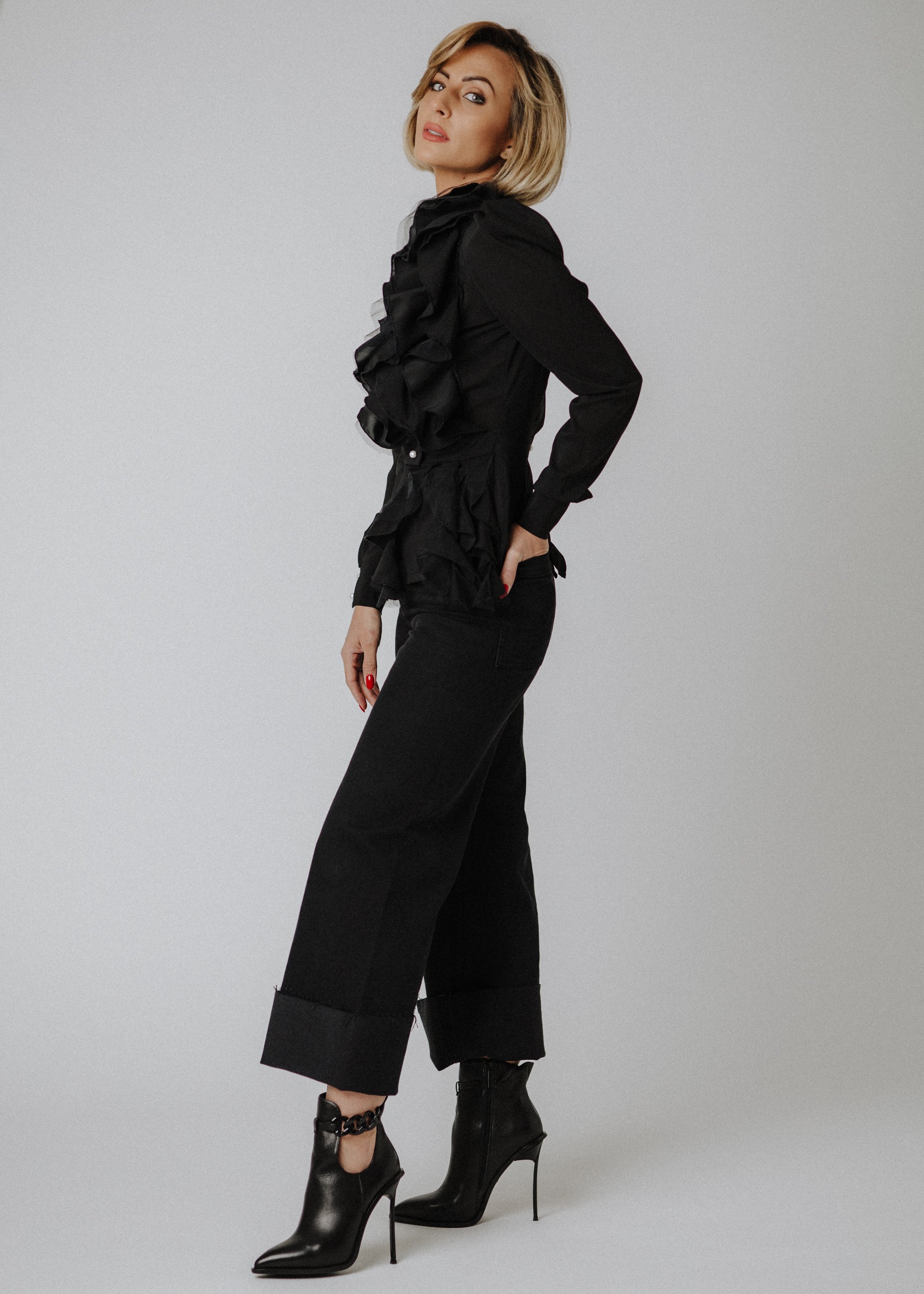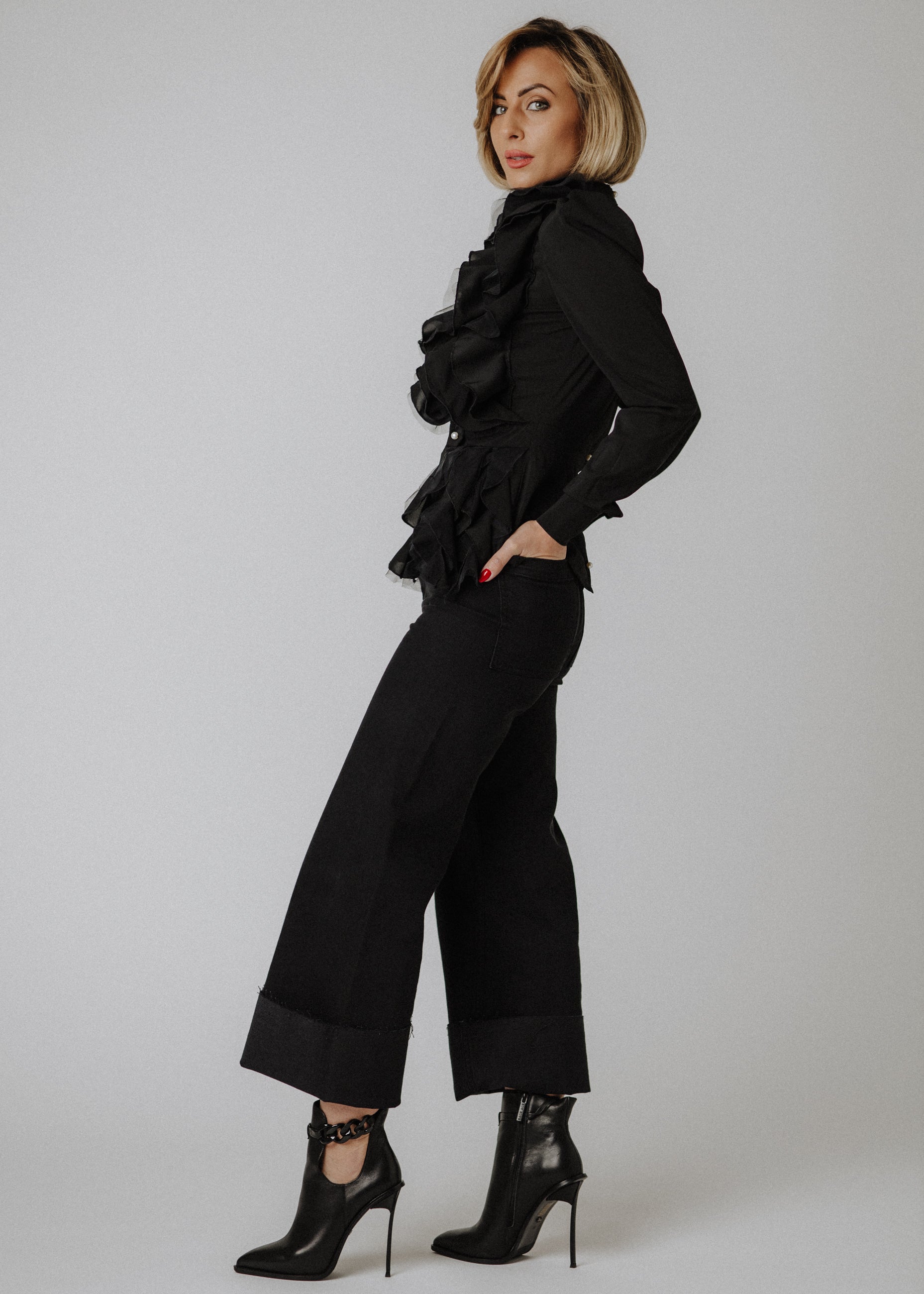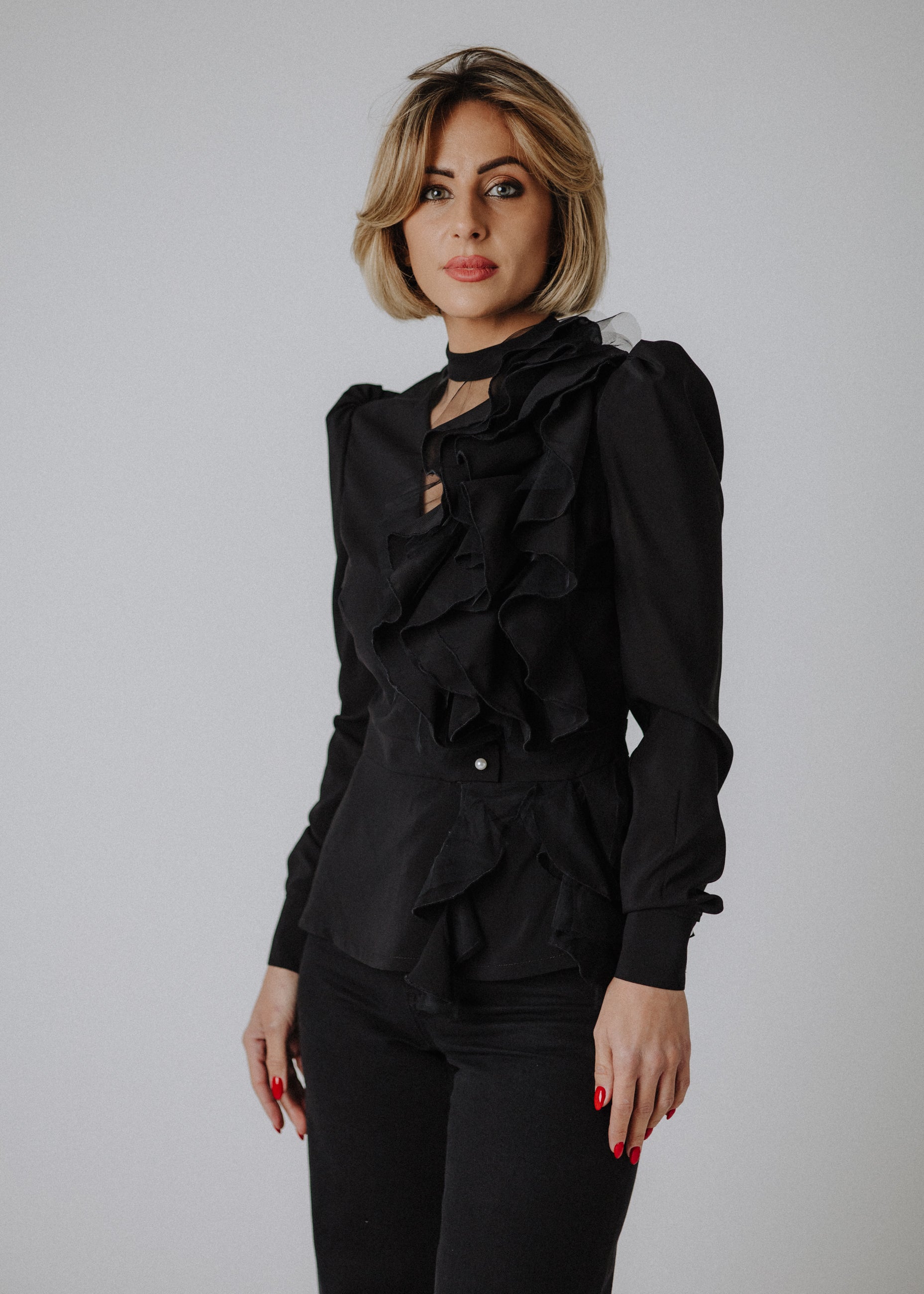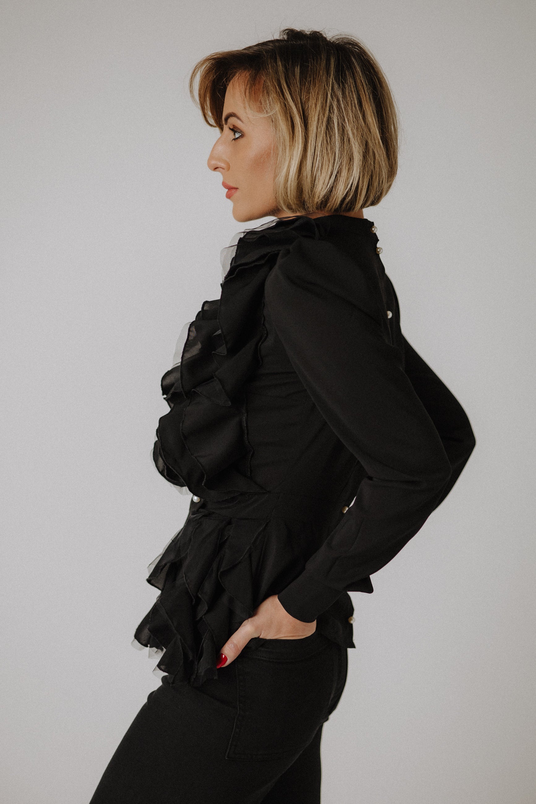 Fekete muszlin felső, lokni fodrokkal muszlinból és tüllből.